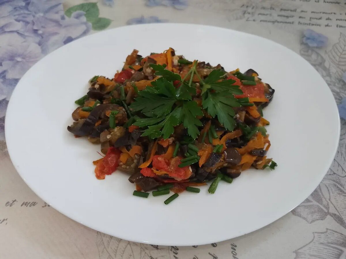 Баклажаны с луком, морковью и помидорами, на сковороде