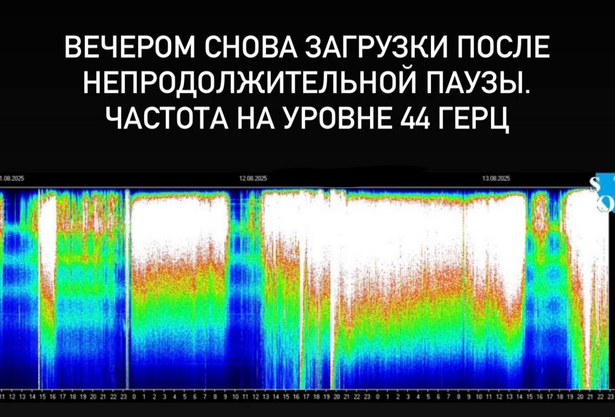 После небольшой паузы активность резко возросла: частота держится на уровне 44 Гц, а планетарное поле буквально переливается белым светом