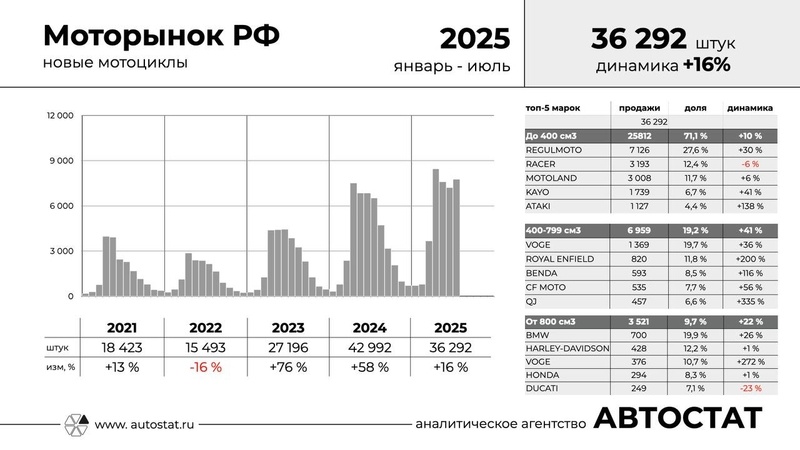 В 2025 году в России зафиксирован значительный рост продаж мотоциклов. Анализируем, какие модели и бренды пользуются наибольшим спросом, и как изменились предпочтения покупателей в разных сегментах мощности. По данным телеграм-канала Сергея Целикова, в период с января по июль 2025 года в России было зарегистрировано 36,3 тысячи новых мотоциклов. Это на 16% больше, чем за аналогичный промежуток прошлого года, что свидетельствует о заметном оживлении рынка мототехники. Наибольший интерес у российских покупателей по-прежнему вызывают мотоциклы с объемом двигателя до 400 см³. На этот сегмент приходится более 70% всех продаж. Однако, несмотря на доминирование малокубатурных моделей, их реализация снизилась на 10% по сравнению с прошлым годом. В пятерку самых популярных брендов в этой категории вошли Regulmoto (7126 единиц), Racer (4193), Motorland (3008), Kayo (1739) и Ataki (1127). Средний класс, включающий мотоциклы с объемом двигателя от 400 до 799 см³, демонстрирует наибольший прирост —