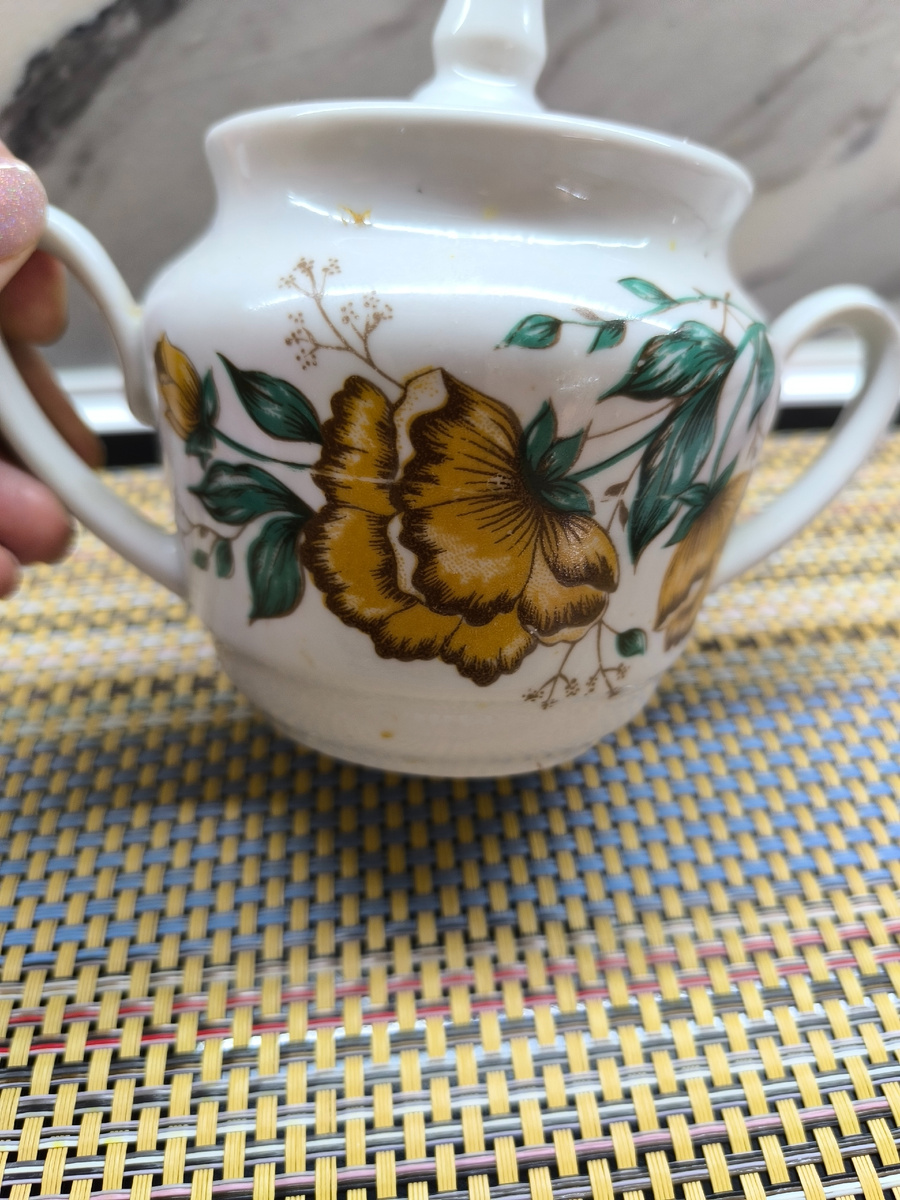 Добрый день или вечер! Продолжаю, в гостях высматривать красивую посуду. Я немного западаю на чайники, поэтому такой обзор. 1.Сахарница советского периода, с цветочным декором крупными маками. Широкая полоса позолоты по краю крышки и на ручках. Клеймо "бегущая лань" Городницкий фарфоровый завод (1970-2000 гг.), предполагаю произведено начало восьмидесятых. 2.Заварочный чайник с ягодными мотивами, а именно гроздья малины. Удобная ручка и носик облегчают наливание напитка. Оригинальная крышка и стильный дизайн делает чайник привлекательным. Клеймо "цветочек" от Сумского фарфорового завода произведено 1996 год. Этот чайник часто используют для приятного чаепития. 3.Далее заварочный чайник с интересными тюльпанами. На одном бочке чайника надпись "с праздником", предполагаю, что эта партия была выпущена к какому-то празднику, может быть к восьмому марта. Клеймо "очертание купола" Самаркандский фарфоровый завод, чайник предполагаю произведено в середине семидесятых годов. Следуя,