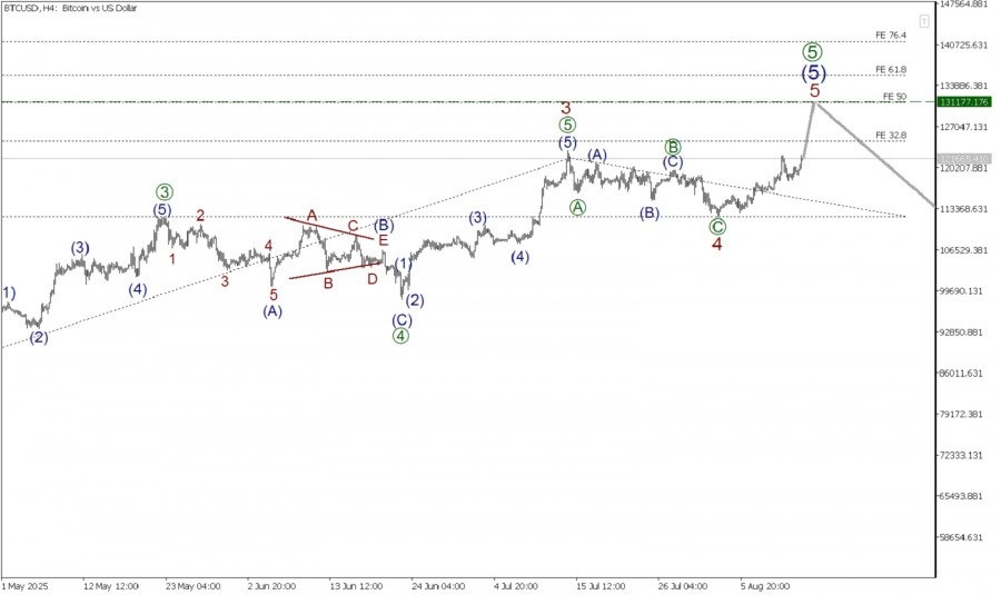 В долгосрочной перспективе по криптовалютной паре BTC/USD может формироваться крупный бычий импульс (1)-(2)-(3)-(4)-(5