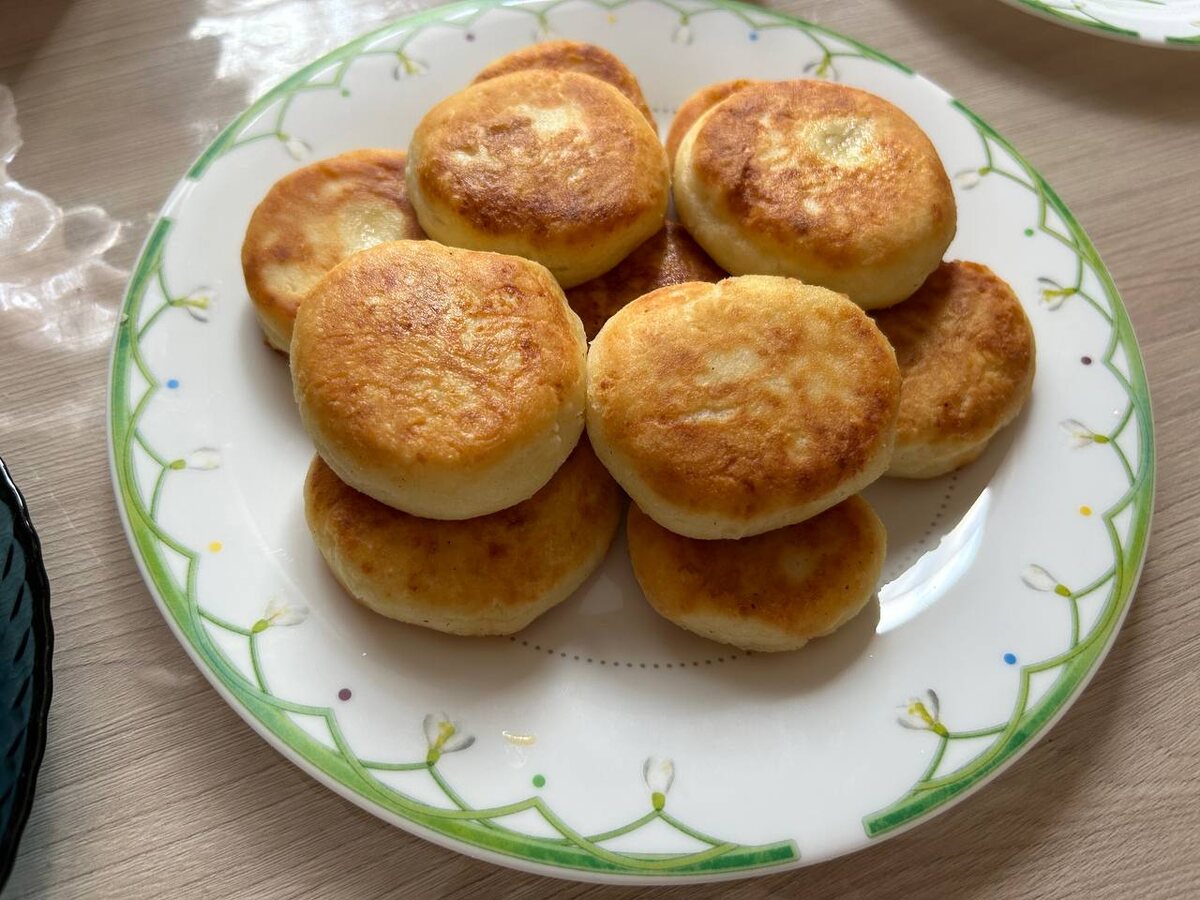 💡 Маленький секрет: убери тесто в холодильник на 40–60 минут — оно станет послушным и менее липким. Достаем тесто, мокрой ложкой отмеряем по 40 г, скатываем в шарики и слегка прижимаем, формируя сырники.