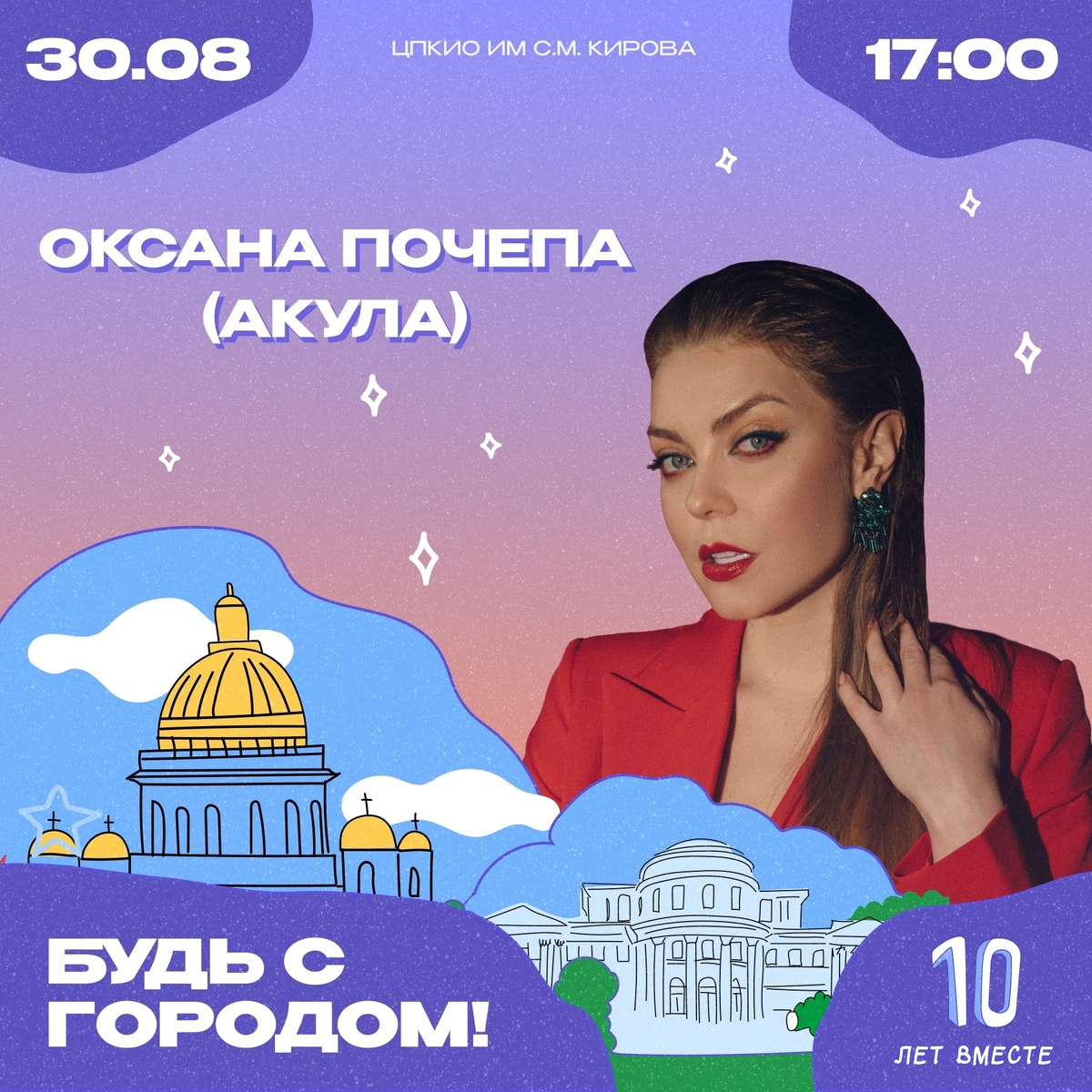 Одной из участниц юбилейного фестиваля «Будь с городом!» станет Оксана Почепа (Акула) (https://vk.com/club121031) — героиня эпохи клубной музыки нулевых, чей голос звучал из каждого магнитофона и на каждой дискотеке.