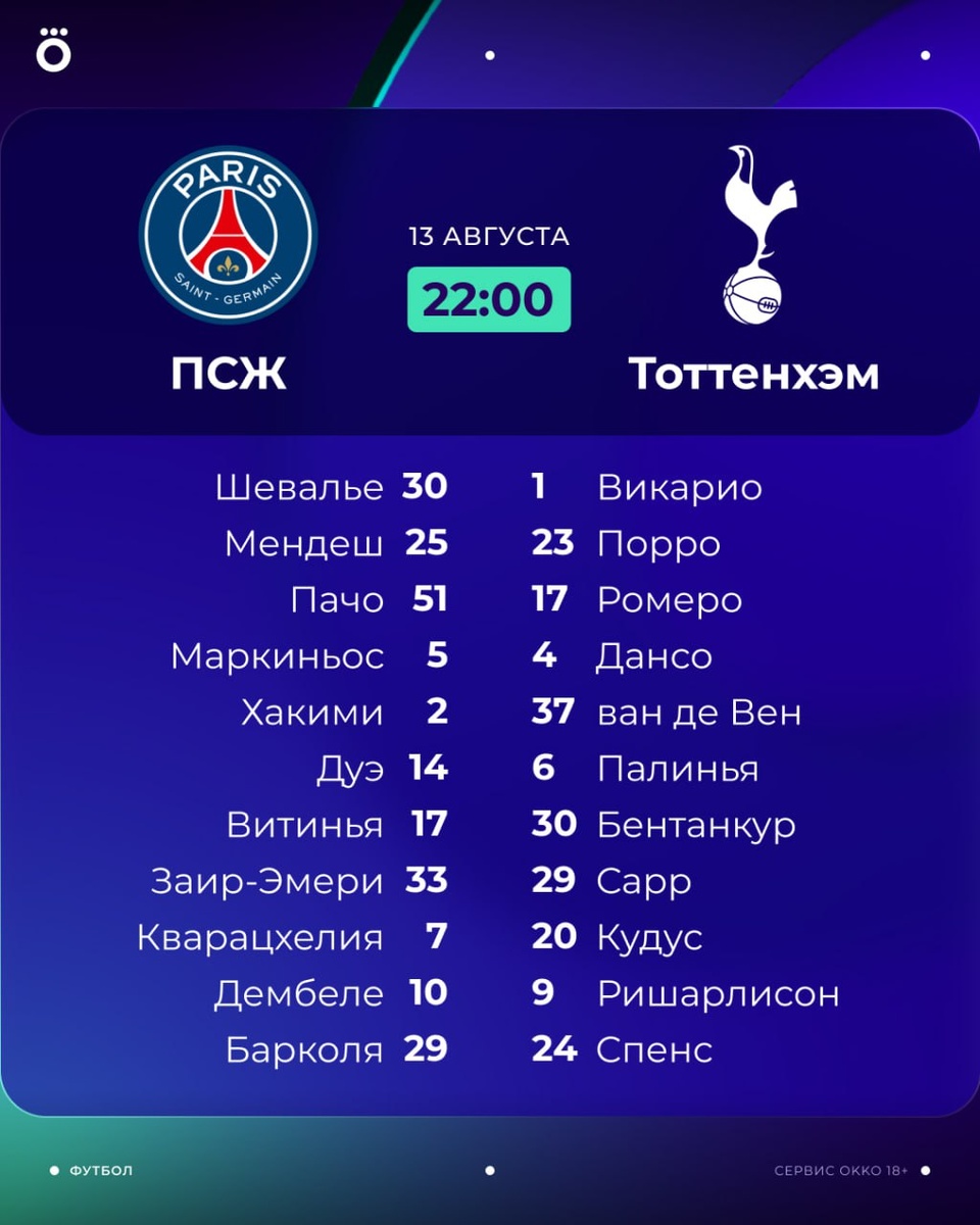 🏆 Составы на Суперкубок! Шевалье в воротах «ПСЖ», у «Тоттенхэма» заметные перестановки по сравнению с чемпионским составом. ❤️ — за Париж 🔥 — за Лондон