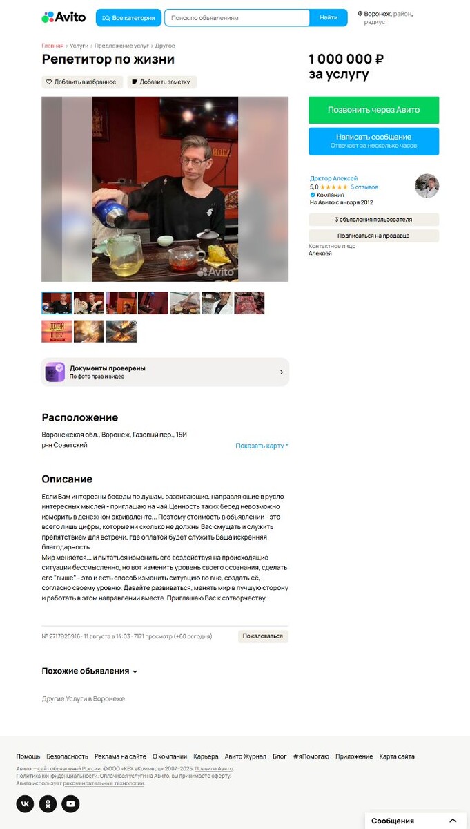 На популярной площадке Avito появилось необычное объявление: житель Воронежа под псевдонимом «Доктор Алексей» предлагает услугу «Репетитор по жизни» за символическую (по его словам) цену в 1 000 000 рублей.