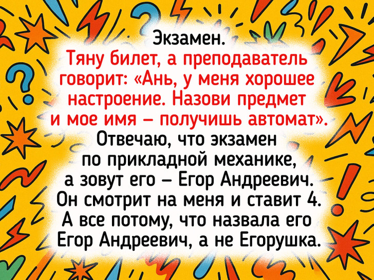 Экзамен. Тяну билет, а преподаватель говорит: «Ань, у меня хорошее настроение. Назови предмет и мое имя — получишь автомат». Отвечаю, что экзамен по прикладной механике, а зовут его — Егор Андреевич. Он серьезно смотрит на меня и ставит 4. А все потому, что назвала его Егор Андреевич, а не Егорушка. © Палата № 6