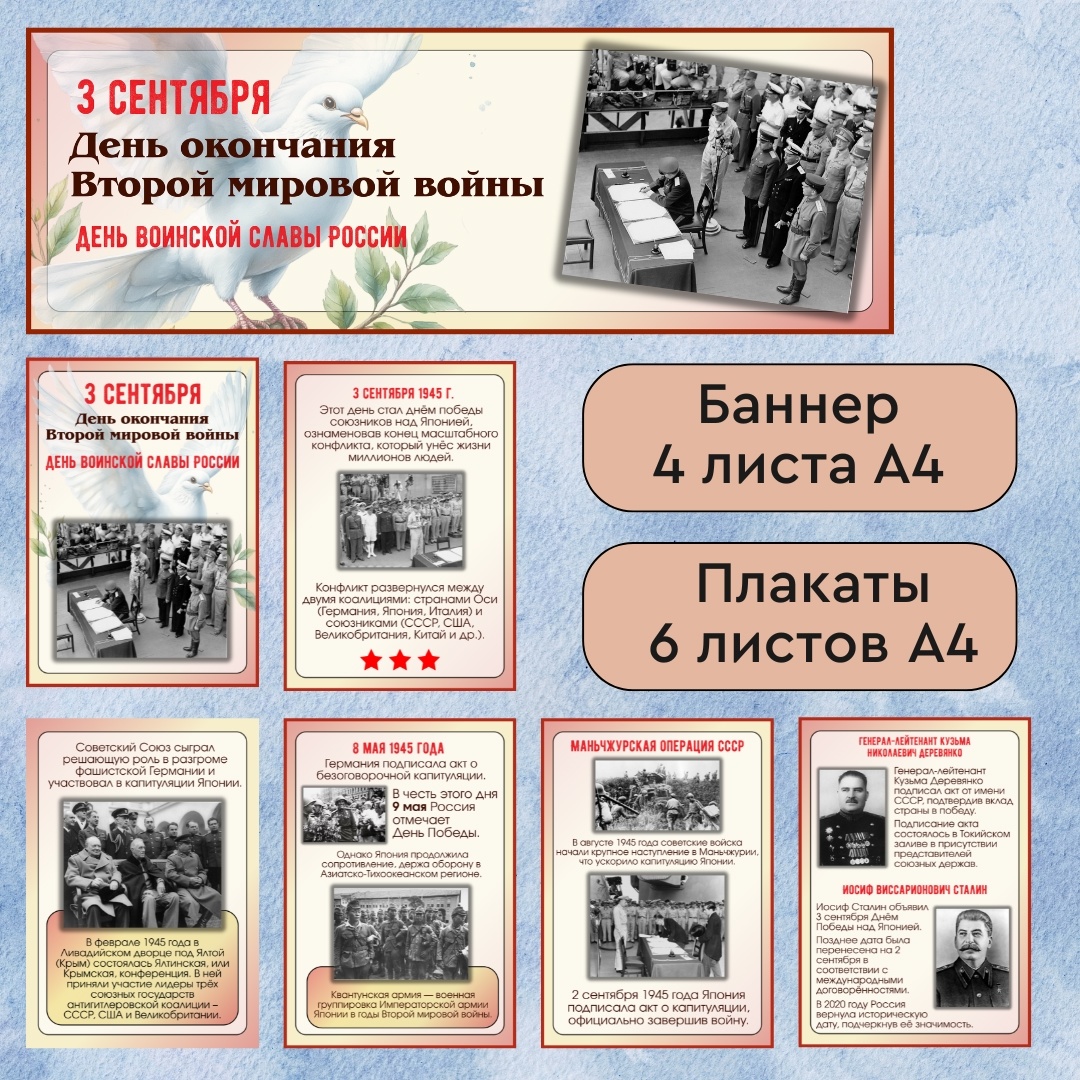 Комплект ко Дню окончания Второй мировой войны (3 сентября). 3 сентября — особая дата в истории России и мира, День воинской славы России, день, когда закончилась Вторая мировая война. Этот комплект поможет учителям ярко и содержательно провести классный час, тематическое мероприятие или оформить школьный стенд. В комплект входит: Баннер-растяжка — 4 листа А4; 6 информативных плакатов формата А4, рассказывающих: Особенности: Лаконичные, понятные тексты для детей школьного возраста. Чёткие фотографии и архивные изображения, создающие атмосферу времени. Удобный формат — можно оформить школьный коридор, кабинет истории или стенд в библиотеке. Для чего подходит: Формат: PDF, готово к печати. Этот комплект поможет школьникам лучше понять историческую значимость 3 сентября как Дня Победы над Японией и окончания Второй мировой войны. Скачать: В Контакте Сайт Инфоурок