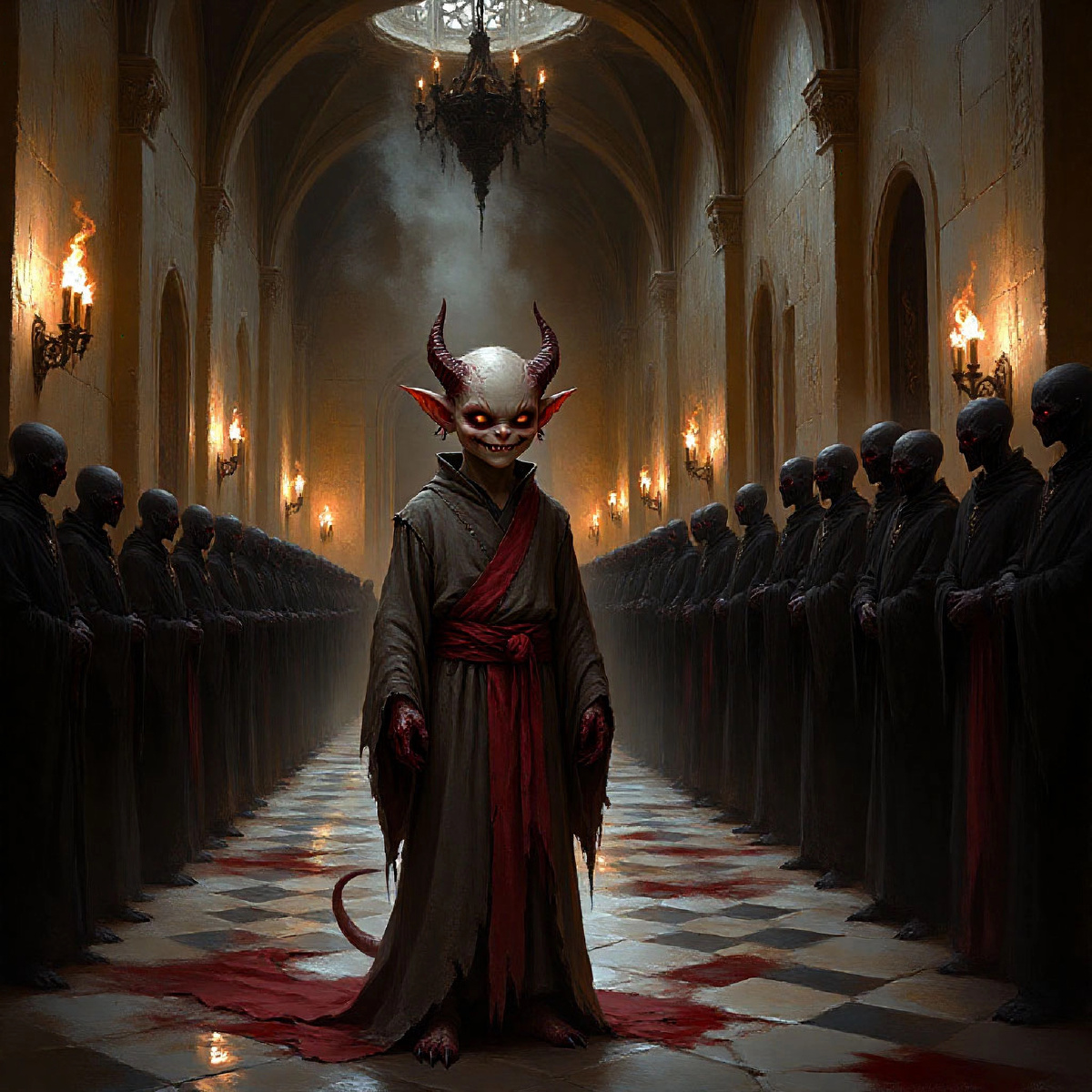 Грызлик, сжимая в когтях драгоценный пергамент, отступил от стола, уступая место следующему, ещё более рогатому демону. Он огляделся. Тысячи таких же, как он, с глазами, полными отчаяния и нетерпения, бродили по залу или сидели на скамьях, сложенных из человеческих костей.