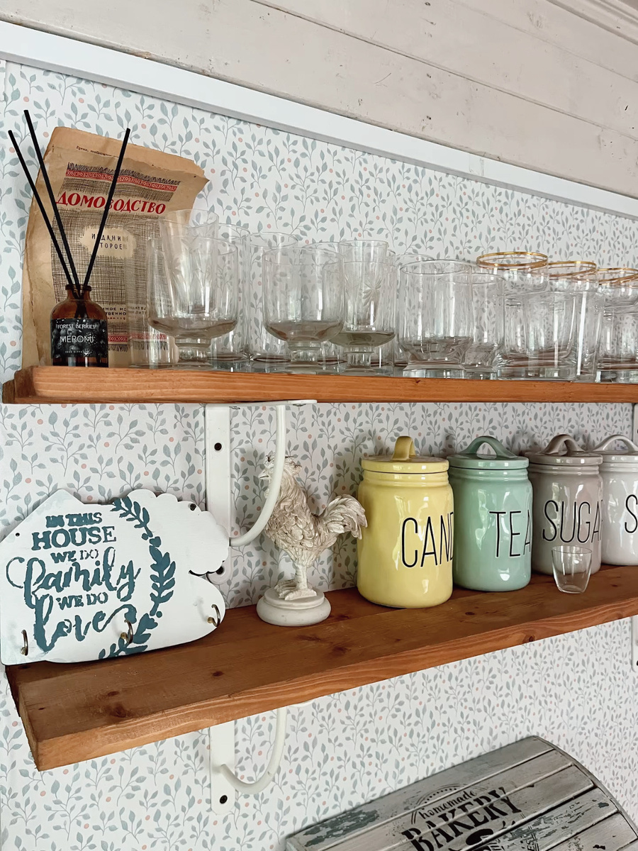Привет, друзья! С вами я Сонька- золотые ручки, и я продолжаю превращать дачный дом бабушки и дедушки в место, где хочется проводить время с удовольствием. В прошлом году мы уже сделали ремонт на кухне: переклеили обои и зонировали пространство на обеденную часть и зону готовки. Но осталась одна проблема — нижние шкафы выглядели как настоящий конструктор из разных гарнитуров. Пора это исправить! От классических верхних шкафов я отказалась ради визуальной лёгкости. Взамен я повесила пару небольших открытых полок, где храню бокалы и крупы. Что касается нижних тумб, то они были крепкими и со своей главной задачей — хранением посуды — справлялись отлично. Но была одна проблема: моя кухня представляла собой настоящую «сборную солянку». Всё было из разных комплектов и отличалось по высоте, цвету и стилю. Чтобы кухня наконец стала выглядеть целостной, нужно было: 1. Выровнять высоту – добавили бруски под ножки, чтобы все тумбы стали одинаковыми. 2. Объединить цветом – решила перекрасить фа