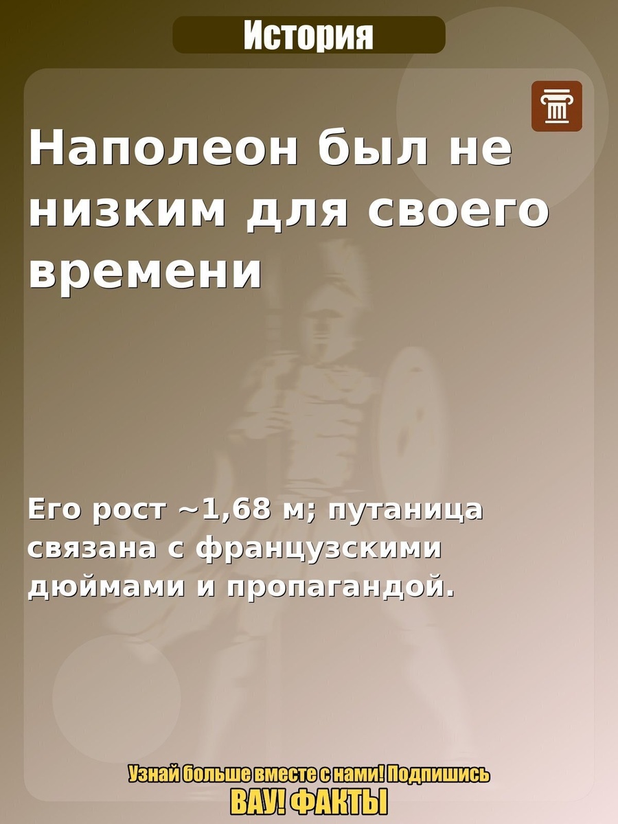 Наполеон был не низким для своего времени. Его рост ~1,68 м; путаница связана с французскими дюймами и пропагандой. Интересный факт по теме «История»: Наполеон был не низким для своего времени. Почему так: Его рост ~1,68 м; путаница связана с французскими дюймами и пропагандой.. Поделитесь в комментариях, знали ли вы об этом и стоит ли делать продолжение по теме. #история #факты #удивительно