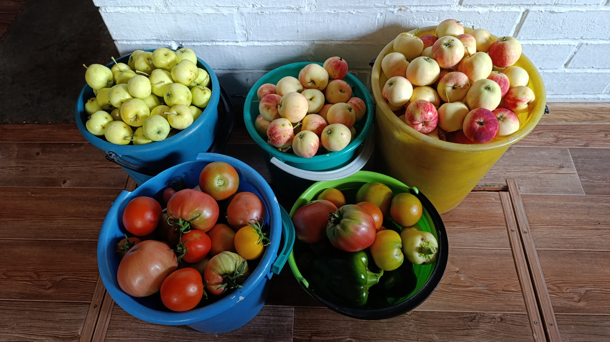 Заодно собрала урожай. Перцы, помидоры, огурцы. Нарвала яблочек с дерева. Падалицу брать уже не стала, как и собиралась. Сразу же изрезала одно ведро на сушку. Оставшиеся два предназначались на сок, но заняться этим не было времени. Приехали гости, они же помощницы. Моя сноха Лена и её мама. Я позвала их насобирать яблок, с тем, чтобы они сами себе законсервировали (ну и употребили свежими конечно). По прогнозу вот-вот должен был пойти дождь, поэтому я тоже бросилась им помогать. И меньше чем за два часа мы набрали больше ста литров. Честно говоря, я не представляю как сватья справится с таким объёмом). Учитывая, что она целыми днями занята с внуками второй дочери. Ну, наверняка ещё и им увезёт. Пусть, мне не жалко для своих. А по чужим... Я давно решила, что излишки урожая им я не буду предлагать. Ты работаешь, выращив