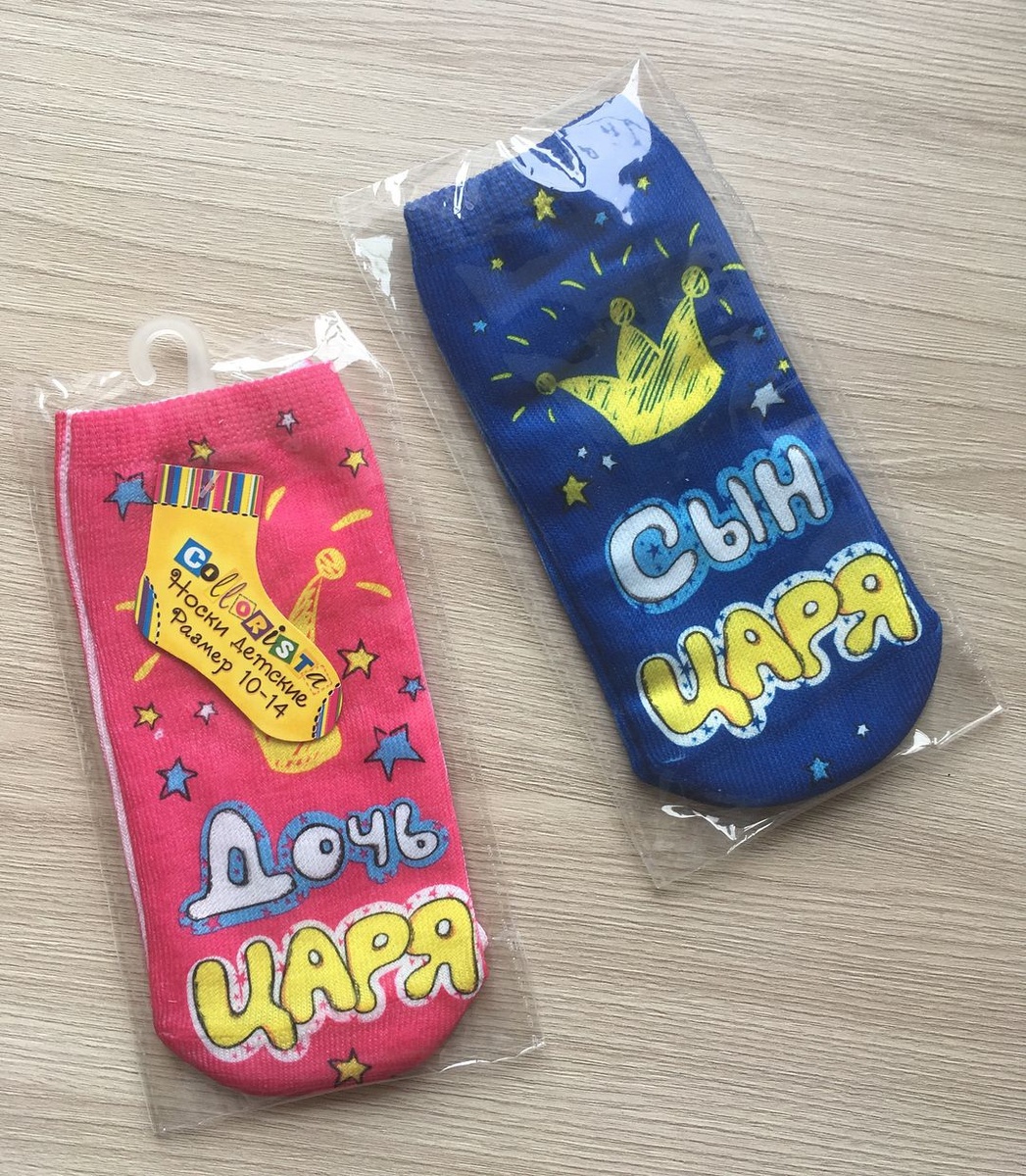 Пришла в офис одного онлайн магазина, чтобы забрать доставку товара и обратила внимание на витрины со всякой мелочью. Моё внимание привлекли яркие детские носочки с надписями "Сын Царя" и "Дочь Царя". Они не были хорошего качества, но привлекли своей яркостью.