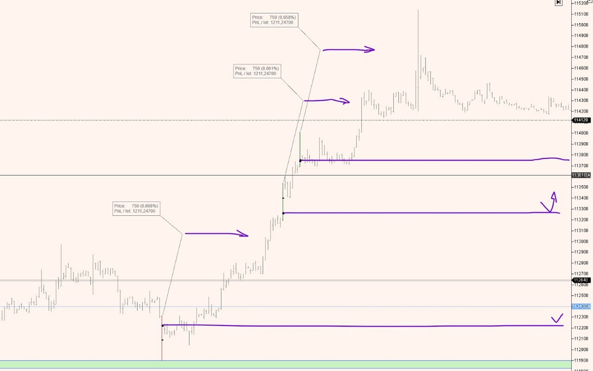 📊 Вчера прошло 3 усилия по стратегии 750. Согласно условиям стратегии, в работу берётся только усилие №2 — и оно достаточно быстро дало прибыль 750 пунктов.