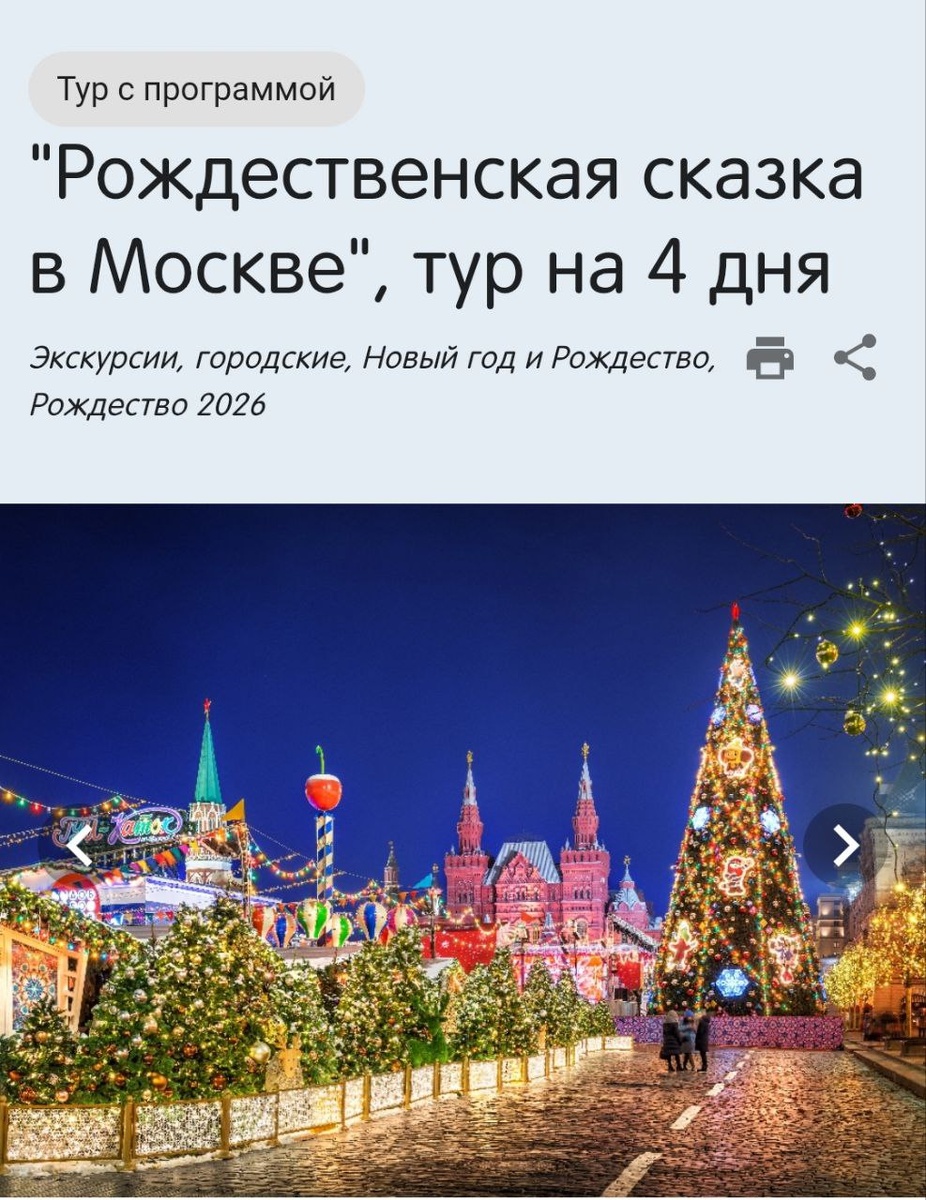 В программе тура: вечерняя экскурсия "Огни Рождественской Москвы", на смотровую площадку Панорама 360, 89 э. башни Федерация Москва-Сити, в музей-усадьбу «Царицыно». Посещение территории Московского кремля и Успенского собора.
