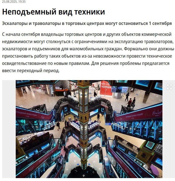🛗 В торговых центрах России с 1 сентября эскалаторы и траволаторы рискуют встать, сообщают СМИ