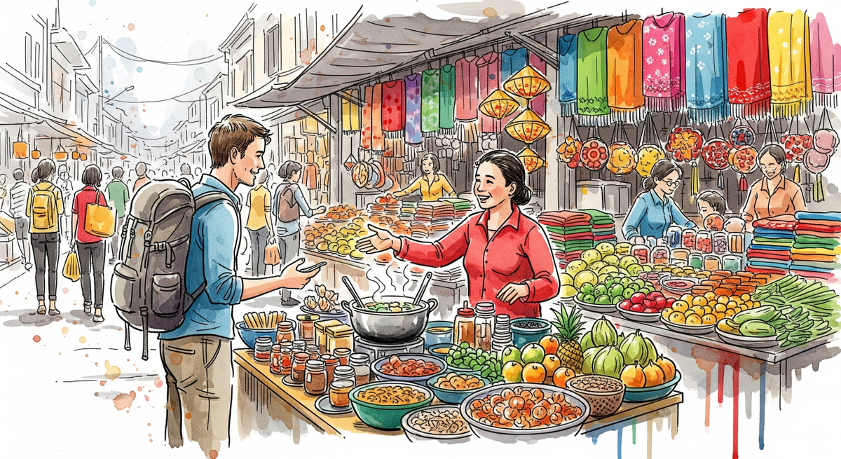Уличные рынки - это сердце и душа многих городов Юго-Восточной Азии, включая Вьетнам. Здесь бурлит жизнь, царят ароматы экзотических фруктов и специй, и можно найти все, что угодно. Чтобы ваше посещение рынка было не только интересным, но и успешным, я собрала 25 полезных фраз на английском языке, а также три коротких диалога, которые помогут вам общаться с продавцами (подходят для уровней A2–B1). You: "Hello! How much is this?" (показывая на футболку)
