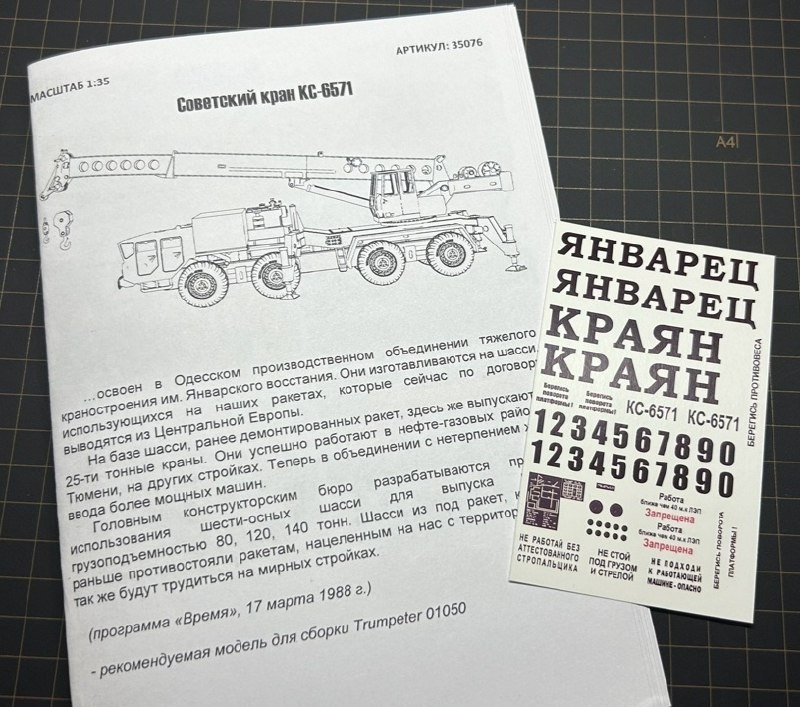 Московская ЪУЪ показала декаль выпускаемого на 3D-принтере конверсионного набора для постройки модели советского тяжелого автокрана КС-6571 на базе МАЗ-7313 в масштабе 1/35 от Trumpeter.