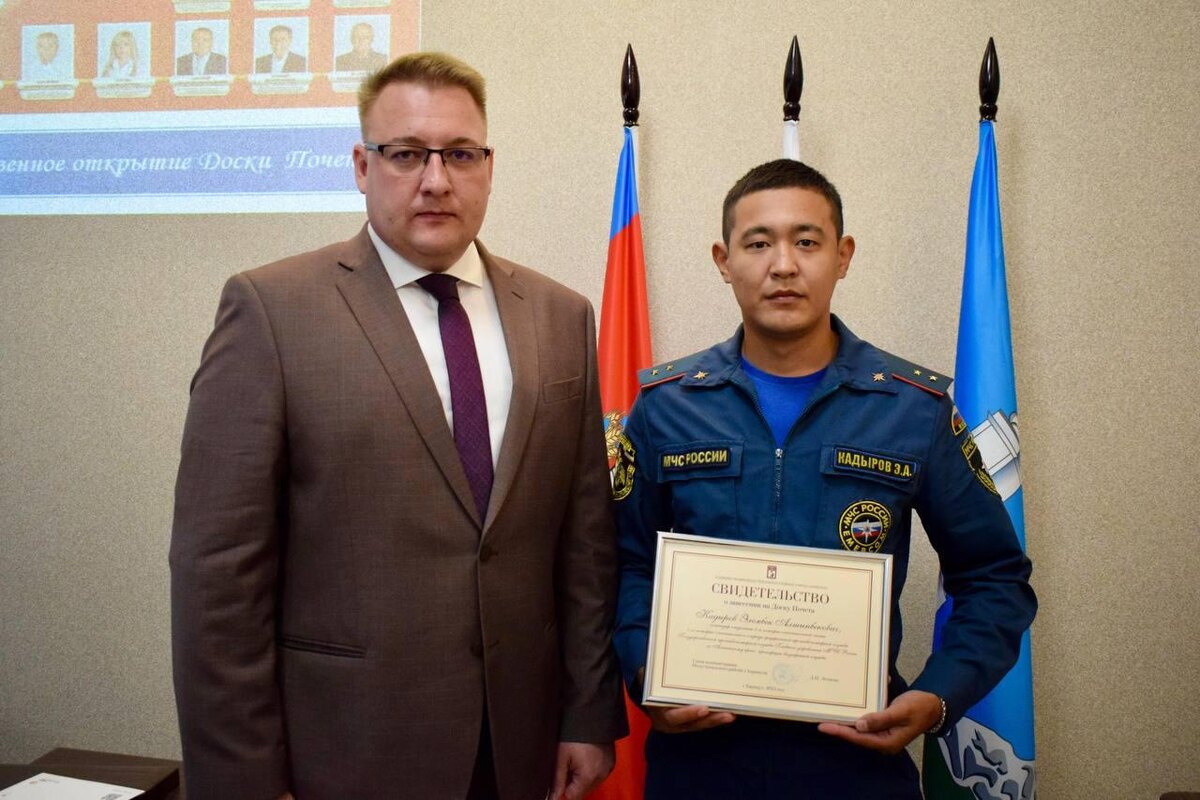 Пожарный на Доске почета В преддверии празднования 295-й годовщины города Барнаула в торжественной обстановке состоялось открытие районной Доски Почета, расположенной у здания администрации Индустриального района. На обновлённую Доску почёта занесены имена 20 заслуженных людей и 6 коллективов, внёсших значительный вклад в социально-экономическое развитие района. Среди них – руководители организаций, водители, преподаватели, медработники, работники жилищно-коммунального хозяйства, культуры, строительства и пожарной безопасности. Среди отмеченных высокой наградой - командир отделения пожарно-спасательной части № 2 Главного управления МЧС России по Алтайскому краю Элембек Кадыров. Это не просто формальная награда, а народное признание. Каждый день этот человек рискует собой, чтобы мы могли спать спокойно. Теперь его лицо, озаренное доблестью, будет встречать жителей Индустриального района как символ отваги и надежности. За его плечами годы безупречной службы, сотни спасенных жизней и