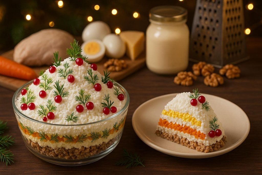 Помню, как впервые увидела этот салат на новогоднем столе у подруги… Белоснежная горка, а когда разрезали — внутри целая радуга слоев! Но самое удивительное случилось, когда я попробовала повторить.