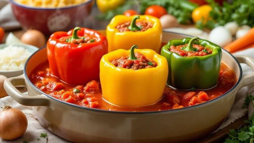 Фаршированные перцы в томатной заливке — это классика, которая никогда не выйдет из моды! В каждом перчике — маленький мир вкуса: сочное мясо, нежный рис, ароматные овощи, объединённые волшебной томатной заливкой. Это блюдо умеет собирать семью за одним столом.