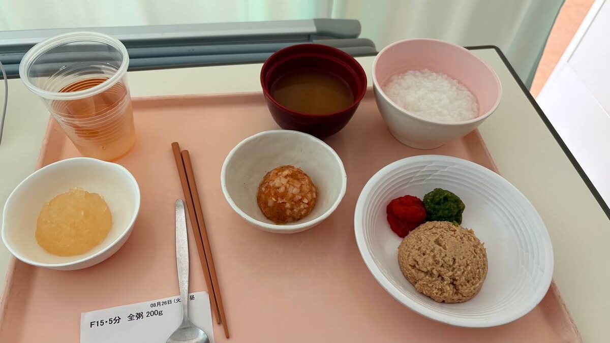 У многих наверное есть куча вопросов, что японцы дают на обед в больницах? Во первых все сильно зависит от самого пациента и его показаний. То есть тут всем дают разные сеты. В моем случае, это перемолотые овощи, фрукты и Курина грудка в блендере ☘️естественно все по отдельности) Мисо и чай)