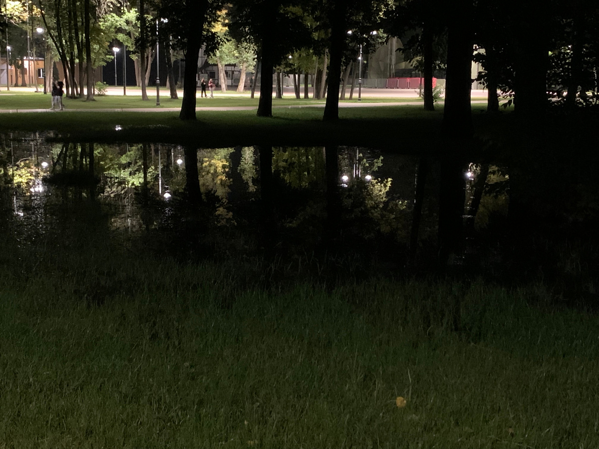 В этом парке я бываю часто, особенно раньше бывал, когда парк был открыт полностью. Спустя примерно год, пока шла реконструкция, этот парк наблюдал только со стороны, через забор. И вот, этим летом снова его двери открыты. И несмотря на то, что работы ещё не все завершены, традицию его посещать, продолжаю. В новом парке был уже около 4-5 раз, но всё это происходило днем. А вот вечером - пока не удавалось. И вот, в конце августа так всё сложилось, что решили мы пробежаться туда именно вечером. Захотелось - и пошли. Сразу обратил внимание, что людей много. Пришлось выбирать момент, чтобы сделать фотки, где не так бы посетители попадали в кадр. Если людей много, значит место пользуется успехом. Не играет музыка - вот за это отдельное спасибо, так как именно в тишине хочется вечером погулять. Чистенько! За парком следят. Кстати, много камер наблюдения и охраны - это тоже хорошо и даже не обсуждается! Фонари красиво светят, подсвечивая кроны деревьев, отражаясь в воде. Именно в этом парке м
