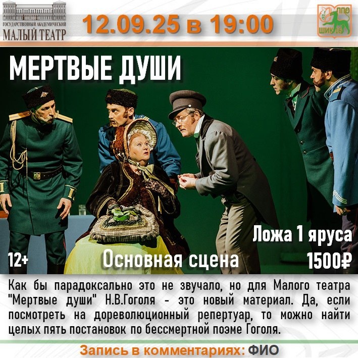 🎭 Спектакль «Мертвые души» 📆 12 сентября в 19:00 🏛 Малый театр, основная сцена 👛 Стоимость 1500₽ 🎫 В наличии 2 билета Действующие лица и исполнители: Чичиков заслуженный артист России Алексей Фаддеев Плюшкин народный артист России Василий Бочкарёв Собакевич народный артист России Валерий Афанасьев /народный артист России Михаил Филиппов Манилов народный артист России Александр Клюквин Коробочка народная артистка России Ирина Муравьева Ноздрёв народный артист России Виктор Низовой Губернатор народный артист России Владимир Носик Губернаторша народная артистка России Алёна Охлупина Дочка губернатора Мария Кривенцева Прокурор Константин Юдаев / заслуженный артист России Василий Зотов Председатель заслуженный артист России Сергей Вещев Почтмейстер заслуженный артист России Василий Зотов Полицеймейстер заслуженный артист России Василий Дахненко и другие 📝Запись в комментариях к посту в telegram-канале ПРОФКОМА ☎Убедитесь, что Ваша заявка принята! Сообщите председателю ППО #МойТеа