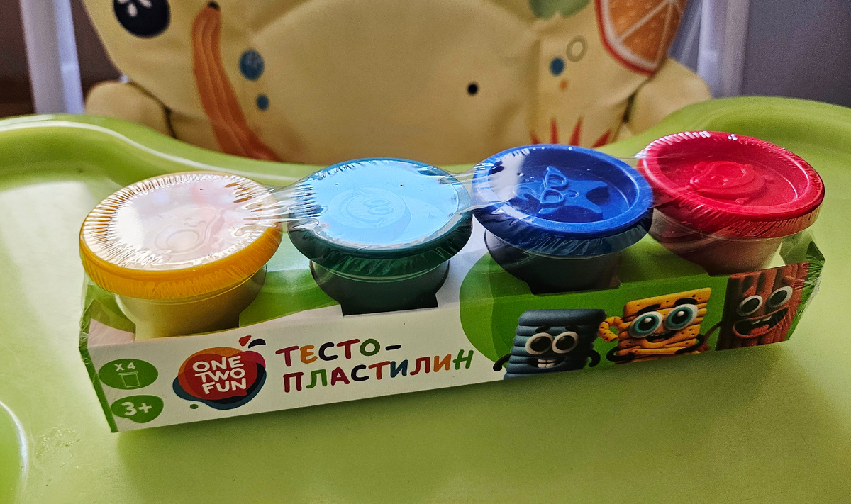 Тесто-пластилин One two fun для детской лепки Тесто для лепки сейчас у нас постоянно в ходу, оно заменило обычный пластилин. Он лежит у нас в запасе, но я его не достаю. Как вспомню, когда старший был маленьким - безформенные комки, прилипшие комочки везде, сложное отмывание... С тестом для лепки давно все изменилось. Покупали этот набор в Ашане, стоил он в районе 130 рублей. Набор запаян в пленку и стоит в картонной упаковке. Всего этом в наборе 4 основных цвета: 🟡Желтый 🟢Зеленый 🔵Синий 🔴Красный Но они есть разные и разных фирм, беру просто или один большой набор, там где 12 цветов, или вот такими отдельными мини - наборчиками. Каждый цвет в своей баночке с крышкой, а каждая крышка соответствует цвету пластилина. Крышки можно использовать как трафареты для лепки. Раскатываете блинчик и припечатываете крышку той стороно, в зависимости от того, какой вы хотите рисунок - объемный или вдавленный. Крышечки в набораз разные. Т.е. в нашем наборе на крышках звезда, авркадо, смайл