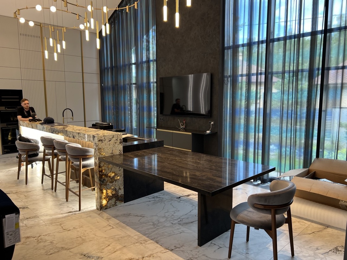 В Челябинске, где ценят не просто ремонт, а создание образа жизни, Konkov.PRO выполняет ремонт под ключ по готовым дизайн-проектам для взыскательной аудитории — состоятельных частных клиентов, предпринимателей и владельцев бизнес-квартир и коттеджей. В одном из недавних проектов центральным акцентом стала барная стойка из натурального оникса с внутренней подсветкой. Мы не делали дизайн и не изготавливали столешницу — за это отвечали мебельщики, — но наша задача была сделать так, чтобы эта роскошная деталь «включилась» в интерьер идеально. И мы сделали это с вниманием к каждой мелочи. Оникс — камень, который живёт светом. Его полупрозрачные пласты играют оттенками, когда сквозь них проходит подсветка: поверхность будто начинает дышать тёплым, медовым сиянием. Такая столешница сама по себе — уже декор, но чтобы эффект раскрывался полностью, нужно всё грамотно интегрировать в пространство. Именно этим и занялась наша команда. Konkov.PRO выполняет полный комплекс ремонтных работ по дизайн-