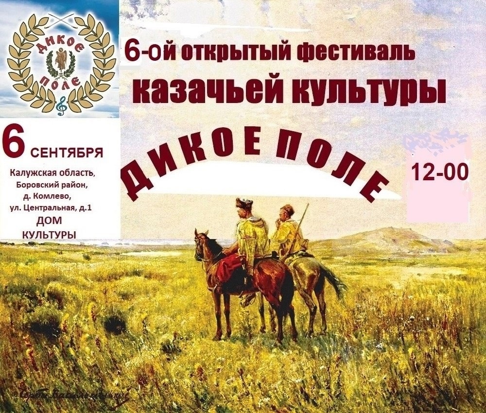 🎶6 сентября в 12:00 в ДК в д. Комлево пройдёт 6-ой фестиваль казачьей культуры «Дикое поле». В программе мероприятия выступления солистов и коллективов из Боровского района, Малоярославца, Калуги, Московской области. Конкурсы, игры, мастерклассы для детей, детская, ярмарка искусств. Справки по тел: +7 (953) 334-69-53 или +7 (926) 595-11-08. Вход свободный. Боровский район, д. Комлево, ул. Центральная, д.1. 👍 Подписаться | Ваша реклама