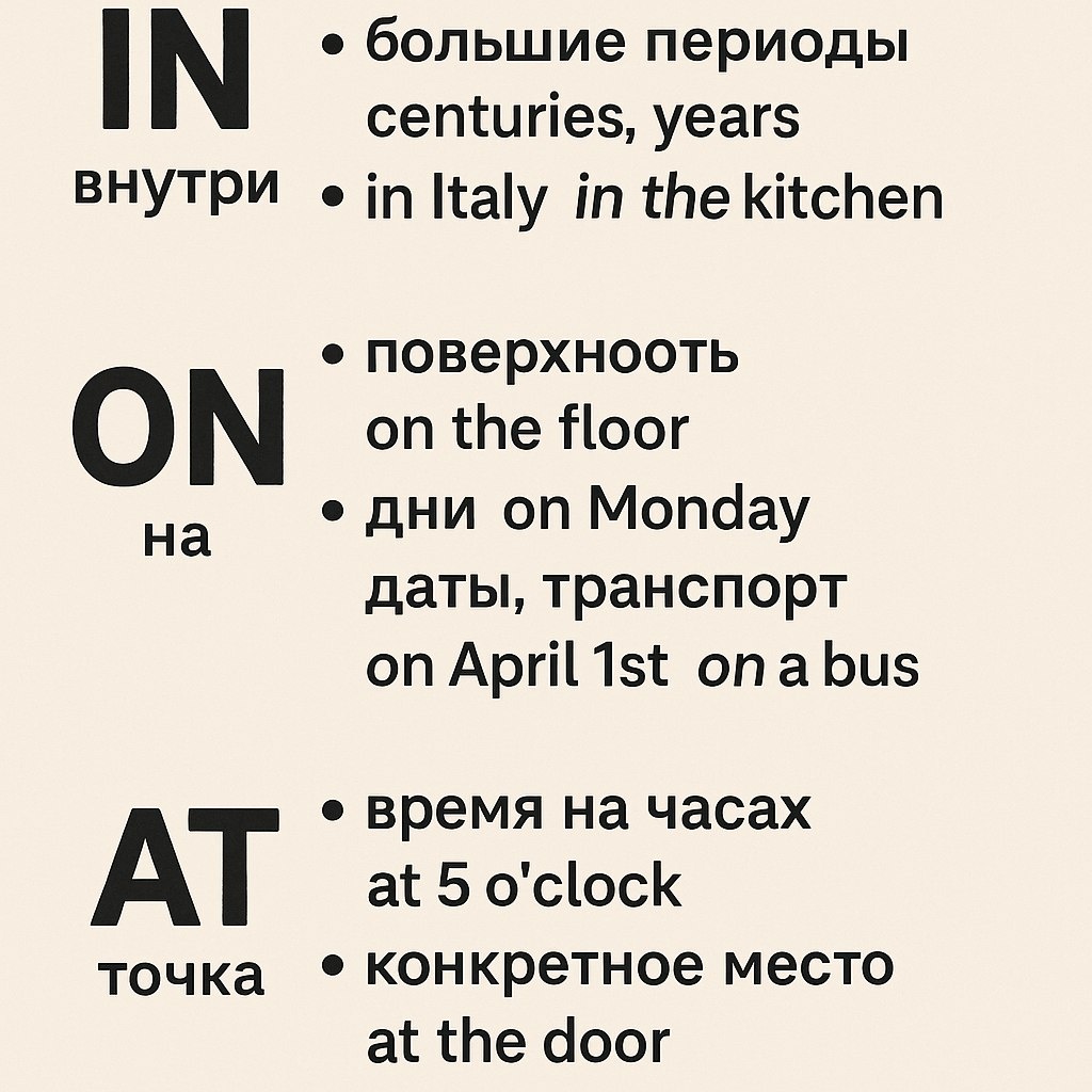 Место (Place): Время (Time): 👉 Легче запомнить: IN = внутри (как в коробке или внутри длительного периода). Место (Place): Время (Time): 👉 Запоминалка: ON = на поверхности или в календаре (конкретный день/дата). Место (Place): Время (Time): 👉 Запоминалка: AT = точка (точка во времени или конкретное место). ✅ Итого для запоминания: В английском предлоги с транспортом зависят от образа «вхождения/нахождения» в транспортном средстве. Автобус воспринимается как «платформа/средство, на которое садятся» (public transport, где можно ходить), а автомобиль — как маленькое замкнутое пространство, в которое заходят. Поэтому — on the bus и in a car. • in — когда вы внутри небольшого, замкнутого транспортного средства: in a car, in a taxi, in a small boat, in a lift (elevator). Идея: вы физически внутри. • on — когда вы на борту или на поверхности, либо когда это общественный транспорт, где можно ходить: on the bus, on the train, on the plane, on a ship, on a ferry, on a bicycle, on a motorc