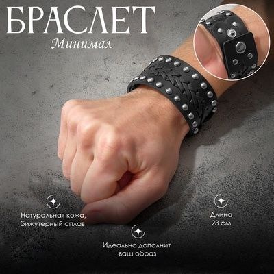 Браслет кожа «Минимал» плетение, цвет чёрный с серебром, 23 см.