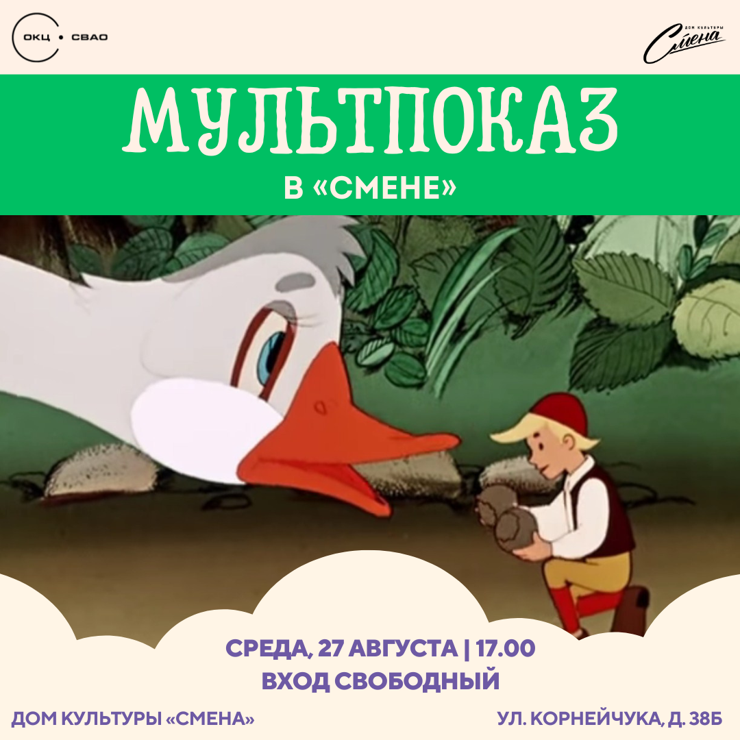 🎬✨ Завтра снова встречаемся в ДК «Смена» на последнем мультпоказе этого лета! 📅 27 августа 🕔 17:00 📍 Концертный зал ДК «Смена» (ул. Корнейчука, д. 38Б) Мы приготовили для вас подборку любимых мультфильмов — настоящая классика, которая всегда поднимает настроение. Приходите всей семьёй провести вечер в уютной и доброй атмосфере! 🌿 Вход свободный.