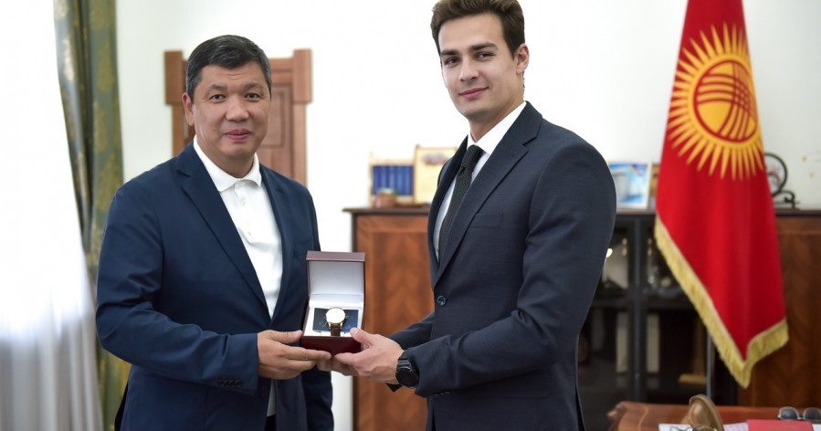 Айбек Жунушалиев сууда сүзүүчү Денис Петрашовго жана анын машыктыруучусуна сыйлыктарды тапшырды