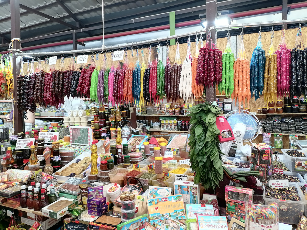 Опять повсюду эта чурчхела, на территории рынка ближе к рядам с одеждой есть два огромных павильона скрытых вот там и советую брать чурчхелу