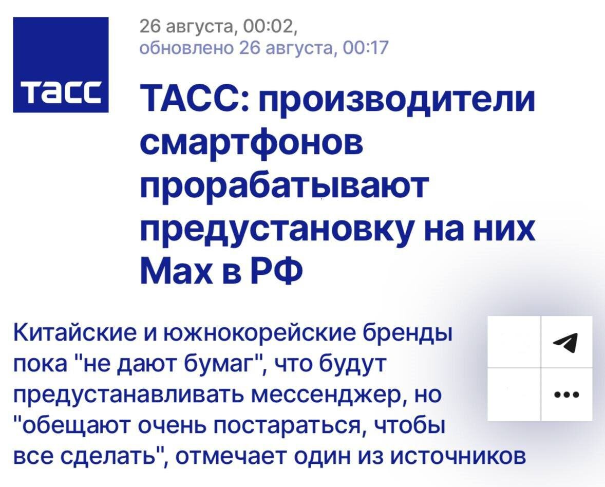 📱 С 1 сентября на всех смартфонах Samsung будет предустановлен мессенджер MAX — южнокорейская компания согласилась на интеграцию госприложения, сообщает ТАСС.