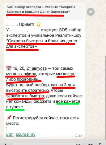 Серия "Как не надо" Вот тут я рассказывала про то, что такое прогревочная слепота и что перестали работать привычные триггеры, и вот сегодня мне прислали вот такой текст приглашения в Ва. Давайте разберем, что тут не так.. 🚫 СЛАБЫЕ / УСТАРЕВШИЕ ТРИГГЕРЫ (работали раньше, сейчас вызывают отторжение) «Секреты быстрых и больших денег» - сразу минус, выглядит как инфоцыганщина. Сегодня аудитория стала более критичной, обещания «быстро и много» вызывают недоверие. «SOS-набор» - попытка сыграть на срочности, но слово «SOS» уже перегорело. Оно обесценено, звучит как хайповый приём. «Как за 3 дня выстроить стратегию» - гиперобещание в короткие сроки, которое выглядит нереалистично. Сейчас работает не «скорость любой ценой», а «устойчивый результат / пошаговый план». «Заработать быстро» - снова триггер быстрых денег. Для многих стало «красным флагом». Больше работает акцент на «системность» и «практическое внедрение». «Даже если всё кажется в тупике» - негативный триггер. Сейчас люди у