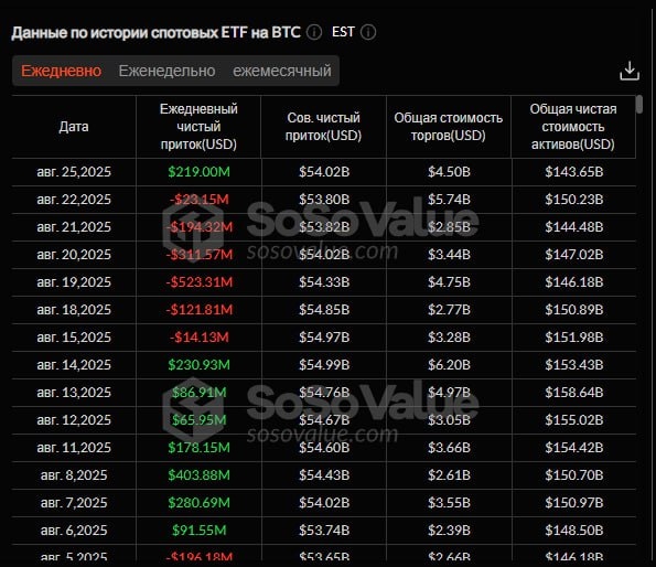 πΈ25 Π°Π²Π³ΡΡΡΠ° ΡΠΏΠΎΡΠΎΠ²ΡΠ΅ Π±ΠΈΡΠΊΠΎΠΈΠ½-ETF ΠΏΠΎΠ»ΡΡΠΈΠ»ΠΈ ΠΎΠ±ΡΠΈΠΉ ΡΠΈΡΡΡΠΉ ΠΏΡΠΈΡΠΎΠΊ Π² ΡΠ°Π·ΠΌΠ΅ΡΠ΅ $219 ΠΌΠ»Π½, ΠΏΡΠΈ ΡΡΠΎΠΌ Π½ΠΈ ΠΎΠ΄ΠΈΠ½ ΠΈΠ· Π΄Π²Π΅Π½Π°Π΄ΡΠ°ΡΠΈ ETF Π½Π΅ ΡΠΎΠΎΠ±ΡΠΈΠ» ΠΎΠ± ΠΎΡΡΠΎΠΊΠ°Ρ