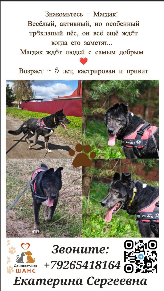 В этот пасмурный вторник зарядись вдохновением и удачей! 💪🌧 Расскажи друзьям о Макдаке ❤️ 🐕 Магдак — трёхлапый супергерой, который доказывает, что физические особенности не мешают жить полной жизнью! Любит гулять, играть и приносить мяч. Его жизнелюбие вдохновляет всех вокруг! Очень просим всех наших подписчиков: ⦁ 📲 Выложите картинку о Макдаке в сторис и статусы ⦁ 🔁 Сделайте репосты этого поста в свой канал #помощьживотным #собакавдобрыеруки #собакавдар #шансожители #взятьсобаку #собакаинвалид