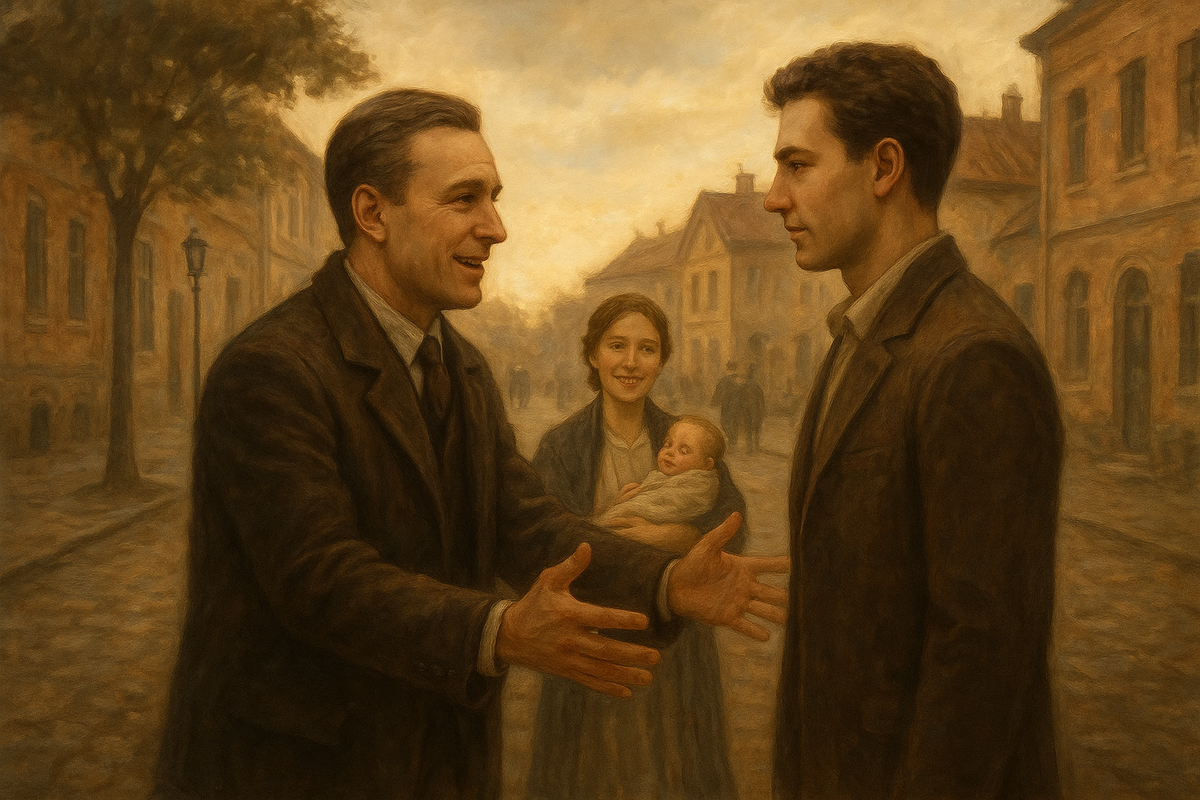 Жил на окраине города один странный человек. Его звали Аркадий, и отличался он от других тем, что он был одаренный умом. Люди шептались за его спиной, смеялись, но никто не знал: что у него было на уме. А в его голове было столько знаний и идей, чем в целой библиотеке. Однажды Аркадий догадался, что время — это не река, а коридор с множеством дверей. И если повернуть «ключ сознания» под особым углом, можно открыть любую из них. Он собрал машину, похожую на кресло с зеркалами и проводами, сел в неё и нажал кнопку. Вспышка света — и вот он уже в прошлом, в небольшом городке столетней давности. Там он встретил девушку с ясными глазами, по имени Мария. Сначала он хотел лишь понаблюдать за прошлым, но сердце его оказалось слабее разума. Они влюбились. У них родился ребёнок — мальчик, похожий на Аркадия. Но пришёл день, когда Аркадий понял: он не может оставаться. Его ждало будущее, его эксперименты, его изобретения. С тяжёлым сердцем он простился с Марией и сыном и вернулся в своё время. В