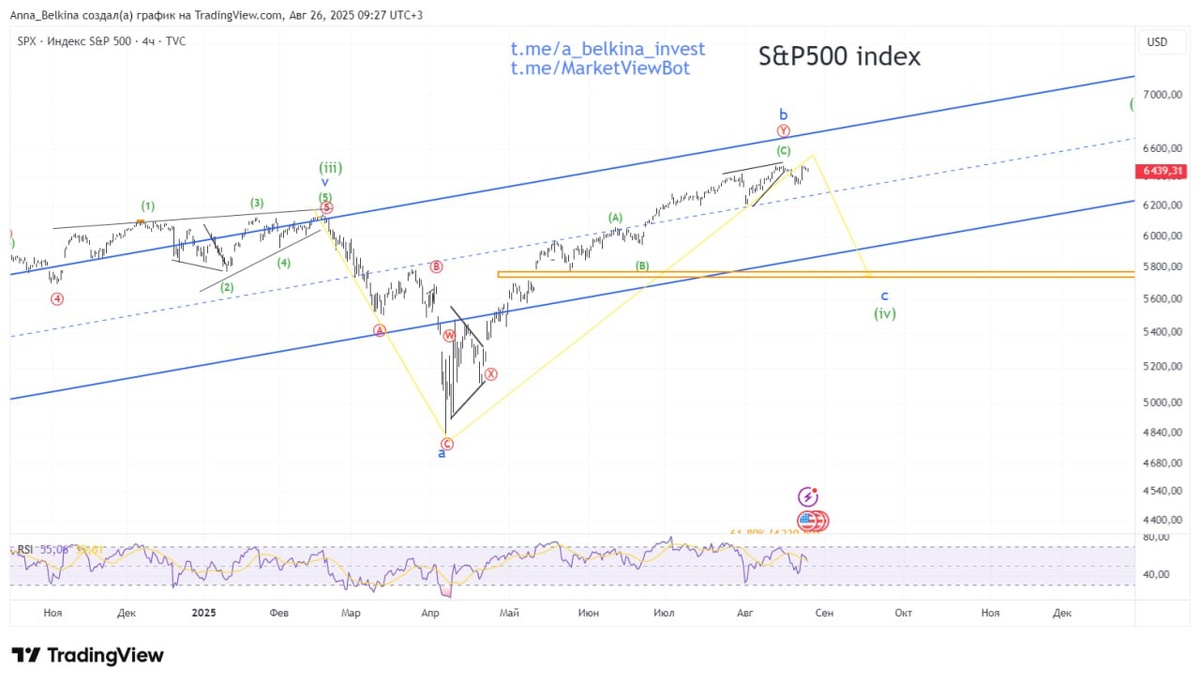 #SP500 Пока американский рынок слабо реагирует на беспрецедентный шаг по увольнению члена Совета управляющих ФРС Лизы Кук. Волна b of (iv) либо поставлена, либо может усложнить последнюю волну в КД – (c) of [y] of b на завершение структуры, обновив локальный максимум. Далее ожидаю увидеть коррекцию на американском рынке. Волна (iv) принимает вид бегущей структуры – это может быть бегущая плоскость или бегущий треугольник. Внизу на индексе есть незакрытые ценовые гэпы, дневной RSI сформировал медвежью дивергенцию, сентимент (индекс жадности и страха) – после проторговки в зоне Экстремальной жадности в начале июля продолжает снижаться, также формируя медвежью дивергенцию с рынками (обновляют верхи). Полагаю, что коррекция американского рынка – вопрос времени, индикаторы указывают на перекупленность. Рынками движут ожидания по смягчению ДКП в сентябре. Но это уже заложено в цены. В среду после завершению торговой сессии отчитывается техгигант – Nvidia. Отчетность Nvidia либо подтвер