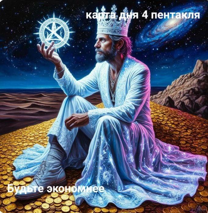 Карта дня 4 пентаклей Она советует сегодня нам быть скромными в тратах, еде и желаниях. Не следует злоупотреблять едой и напитками. Стоит отказаться от крупных покупок и походов по магазинам. А так же не стоит сегодня никому давать в долг, маловероятно, что деньги, данные сегодня, когда либо вернуться к своему хозяину.