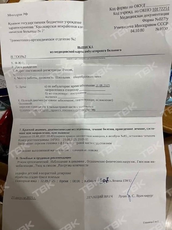 Пенсионерка сломала палец подростку, который не уступил ей место в автобусе в Красноярске. По словам матери школьника, женщина в грубой форме потребовала встать, затем начала тянуть его за футболку, поцарапала руку и пыталась выхватить телефон. В итоге пенсионерка схватила мальчика за палец и сломала ему фалангу. Кондуктор и другой пассажир сделали женщине замечание и проводили на свободное место. Мальчику же пришлось обращаться в травмпункт, где диагностировали перелом пальца и ссадины. Кто прав в этой ситуации? #Красноярск 🇷🇺 В Стране. Подписаться