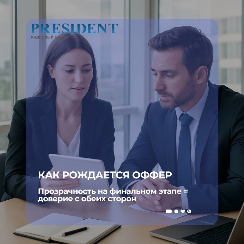 Бэкстейдж: Как мы согласовываем финальный оффер с клиентом Финальный этап подбора — это не просто «отправить предложение». Важно, чтобы оффер был реалистичным для работодателя и привлекательным для кандидата. Как мы действуем: 1️⃣Собираем вводные — зарплатные ожидания кандидата, условия по графику, «обязательные» бонусы. 2️⃣Сравниваем с рынком — показываем клиенту аналитику: среднюю вилку зарплат, что предлагают конкуренты. 3️⃣Формируем оффер — вместе с работодателем прописываем ключевые пункты: компенсацию, бонусы, перспективы развития. 4️⃣Обсуждаем детали — отвечаем на вопросы кандидата до подписания, убираем «слепые зоны». 📍Пример: Недавно мы подбирали финансового аналитика в инвестиционную компанию. Кандидат ожидал 190 000 ₽, у клиента вилка была до 170 000 ₽. Мы предложили решение: оффер на 170 000 ₽ + KPI-бонус в первые 6 месяцев и ускоренный пересмотр зарплаты по итогам испытательного срока. Кандидат согласился, работодатель уложился в бюджет, а задача бизнеса была закрыта.