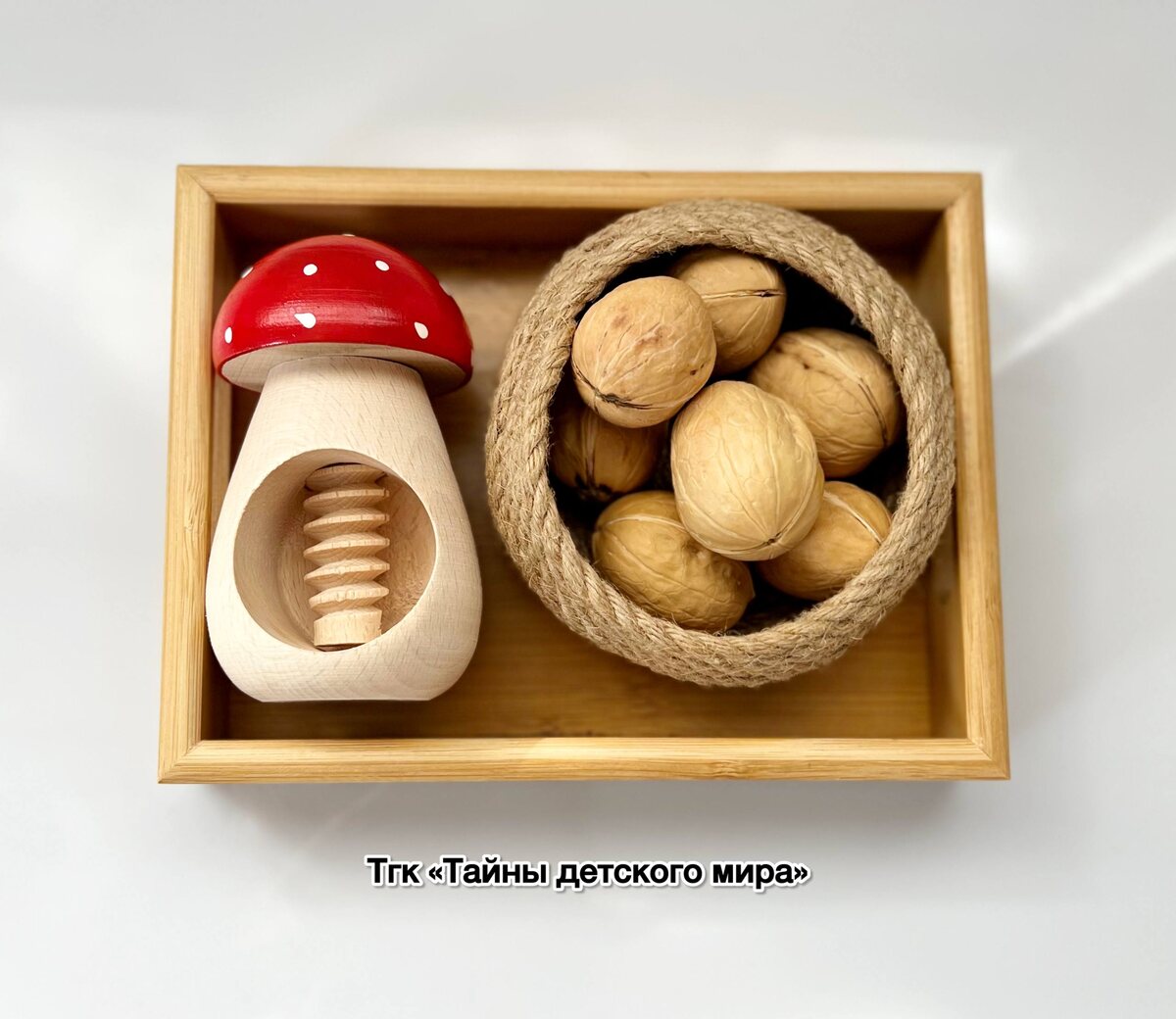 Сегодня я хочу представить вам простое, но гениальное изобретение человечества -орехокол, и это то устройство, которое позволит вашему малышу почувствовать себя мастером кулинарного искусства и героем по добыче витаминов. Вооружившись таким устройством, ребёнок сможет самостоятельно приготовить себе полезный перекус. Ведь орехи — это не просто вкусняшка, а натуральный мультивитаминный комплекс. Малышам до3️⃣лет рекомендую версию орехокола-грибочка с винтом и отверстием. Работая с ним, ребёнок не только сможет практиковать откручивание и закручивание, но и укрепит ручки, повысит концентрацию и усидчивость. Плюс бонус: будет развиваться пространственное мышление, наблюдая, как хитро движется винт. А детишкам постарше пора переходить на профессиональный уровень- вскрытие орехов по прямому назначению.😍 Подготовим рабочее место: На поднос ставим орехокол, три пиалы и салфетку. 🤍Первая пиала — склад орехов 🤍Вторая — сборщик скорлупы 🤍Третья — хранилище ядер. Продемонстрируем техник