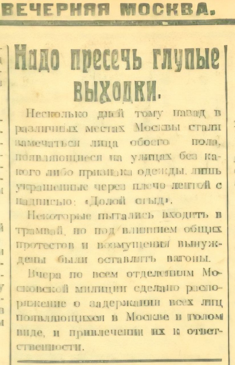 ... или как антисоветчики придумали общество "Долой стыд". Автор: историк Ярослав Листов Фабула этого мифа проста: якобы в 23-24 гг. в СССР было общество "Долой стыд", которое занималось чистым срамом – устраивало на Красной площади парады нудистов в чём мать родила, и также ходили по улицам Москвы. Но нарком Семашко грозно крикнул в статье в "Известиях", и общество схлопнулось, не оставив следов. О том, что оно не оставило следа – это не форма речи, это документальный факт. Прочитав об обществе, кокетливые монархисты и гламурные нацисты кинулись искать срамные фото. Но у столь эпических акций ни хроникёры, ни любители, ни иностранцы не запечатлели. И это на Красной площади столицы! Но, может, это зрелище так шокировало публику, что о нём писали, возмущались, спорили? Отнюдь! Все эпистолярное наследие общества "Долой стыд" сводится к 2 заметкам в газетах (о них ниже), 1 дневниковой записи и 6 мемуарным заметкам, да карикатуре в журнале "Смехач". Вот и все богатые источники мифа. Н