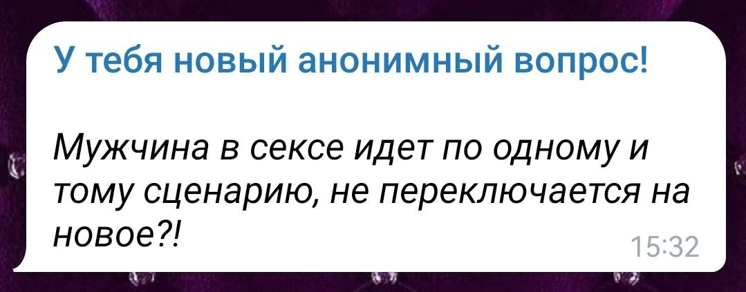 ВАШИ АНОНИМКИ 📝 Вопрос: Мужчина в сексе идёт по одному и тому же сценарию и не переключается на новое? Представьте: у него есть любимое блюдо - и он готов есть его каждый день. Вроде вкусно, сытно, привычно. Но если на столе вдруг появляется что-то новенькое, часть мужчин скажет: "О, интересно, давай попробуем" , а часть - "Зачем менять то, что работает?". 🙃 Всё зависит от темперамента: - консервативный мужчина любит стабильность (и может даже ревновать, если женщина вдруг предлагает что-то новенькое) - более гибкий - с радостью подхватит идею и включится в эксперимент. А вот если у него навязчивые привычки - типа "без порно не могу" или если у него только в одной позе "работает" - то это уже сигнал к разговору, а не к скуке. Сексуальные сценарии можно расширять мягко и ненавязчиво - как будто добавляете новые специи в знакомое блюдо. На наши сексуальные сценарии, и мужские, и женские, влияет многое: - первые знания о сексе - что мы услышали от родителей, друзей или подруг в