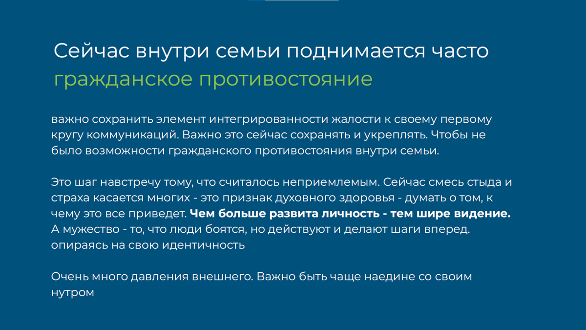 Вот прямая цитата с одного из её слайдов: «Важно сохранять элемент интегрированности, жалости к своему первому кругу коммуникаций.