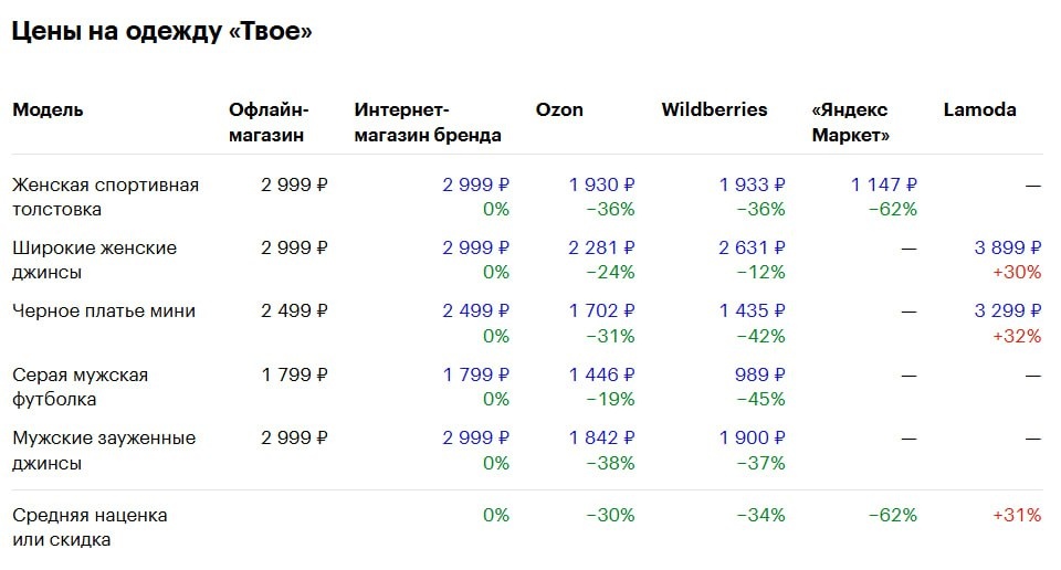 Мы с мужем и детьми не любим ходить по магазинам одежды: нам удобнее одеваться на маркетплейсах. Но знакомые часто говорят, что вещи там дороже: якобы продавцы закладывают в стоимость комиссию, которую платят маркетплейсам с каждой продажи. Виктория решила не принимать гипотезу на веру, а провести исследование и сравнила цены на 15 вещей трех российских брендов. Результаты оказались неоднозначными: https://t-j.ru/tg/clothes-price/