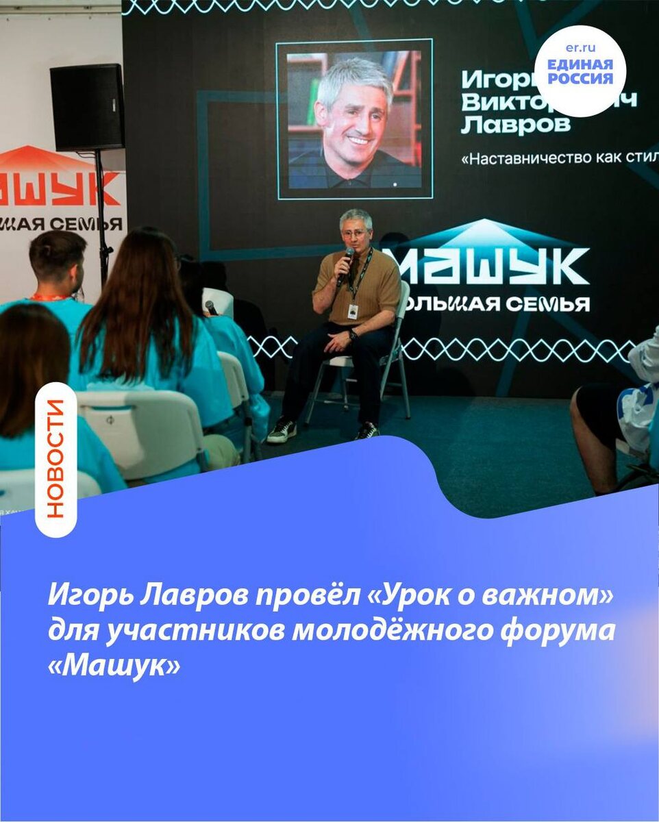 На Ставрополье завершил работу 16 Всероссийский молодёжный форум «Машук» В образовательной программе форума в очередной раз принял участие Региональный координатор партпроекта «Единой Росси» «Детский спорт» в Ставропольском крае, победитель Олимпийских игр Игорь Лавров. Игорь Викторович отметил, что общение с машуковцами оставило незабываемые впечатления: Встреча прошла в цикле Уроков о важном. Общаясь с участниками форума, победитель Олимпийских игр подчеркнул: любое достижение – это стартовая площадка для поддержки тех, кто идёт за тобой. Важно протянуть руку помощи новым поколениям, помочь им идти к своим победам. Одно из таких направлений, активным участником которых является Игорь Лавров – партпроект «Детский спорт». Региональный координатор рассказал форумчанам о том, как он реализуется на Ставрополье, и подчеркнул, что «Детский спорт» не только создает условия подрастающему поколению для занятий спортом, но и помогает сделать в нём первые шаги, стать целеустремленным, почувст